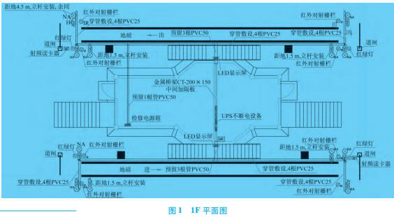 每個地磅的出口端距離邊緣約0. 5 m處,各 設置1套射頻讀卡器(立桿安裝),桿高為1.5 m。磅房所有射頻讀卡器所需電源均引自UPS機柜。 3.2.4智能稱重管控系統