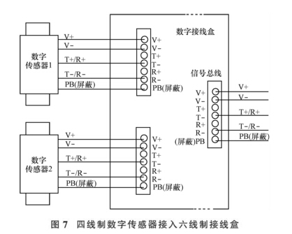 線制數(shù)字傳感器與接線盒連接也是按照“同名接線端相連” 的原則進行連接, 即傳感器與接線盒之間電源 V+接 V+, V-接 V-, 信號發(fā)送正 (T+) 接信號發(fā)送正 (T+), 信號發(fā)送負 (T-)接信號發(fā)送負 (T-), 信號接收正 (R+) 接信號接收正 (R+), 信號接收負 (R-) 接信號接收負(T-), 如圖 6 所示。