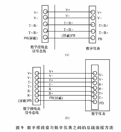 數(shù)字接線盒連接數(shù)字儀表是通過一條信號總線連接。 接線原則要根據(jù)數(shù)字傳感器的線制來決定。 四線制數(shù)字接線盒與儀表按 “ 同名端連接 ” 原則進行連接。 六線制數(shù)字接線盒與儀表是按照“電源同名端連接”, “信號線發(fā)送連接接收 , 正對正, 負對負 ” 的原則接線。  如圖 9(a)、 (b)所示, 分別是四線制和六線制數(shù)字接線盒與數(shù)字儀表的總線連接方法示意。
