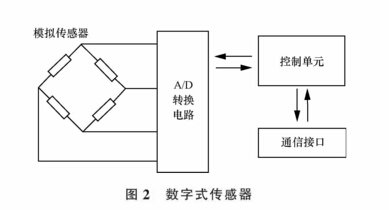 數(shù)字式傳感器的概念是與輸出模擬信號的模擬傳感器相對而言的, 數(shù)字式傳感器是指可輸出數(shù)字信號的傳感器。 現(xiàn)階段使用的數(shù)字式傳感器包括模擬傳感器、 A/D 轉換電路、 控制單元 、 數(shù)據(jù)通信接口 (如圖 2 所示)。