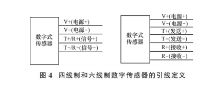 (四根信號線加兩根電源線) 數(shù)字傳感器。 四線制數(shù)字傳感器和六線制數(shù)字傳感器的引線定義如圖4所示。