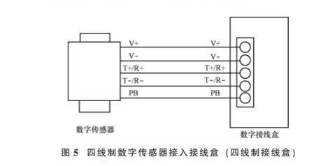 線制傳感器一般使用四線制接線盒。 數(shù)字傳感器與接線盒連接按 “同名接線端相連 ” 的原則進行連接, 即傳感器電源 V+接接線盒中的 V+,