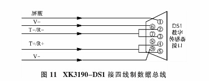 四線制 (RS485 半雙工方式) 時, 應采用半雙工方式連接, 此時在做總線連接頭時應采用圖10 的連法 。 圖 11 中 , 在總線連接 9 芯 D 型插頭時, 應將 2、 3 腳短接, 作為數(shù)字傳感器的信號負(T-/R-), 將 4、 5 腳短接作為數(shù)字傳感器的信號正 (T+/R+)。