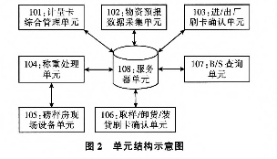 系統由計量卡綜合管理單元、物資預報數據采集單元、進/出廠刷卡確認單元、地磅房現場設備單元、稱重處理單元、取樣/卸貨/裝貨刷卡確認單元、B/S查詢單元和服務器單元組成。單元結構如圖2所示。