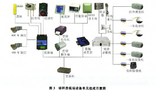地磅房現場設備單元由地磅房現場的各種設備組成。如稱重儀表、MOXA卡、RTU控制器、交換機、液晶屏、道閘、紅綠燈、拾音器、音柱、攝像頭、紅外對射、打印機、照明攝燈、讀卡器、硬盤錄像機、功放等。該單元的主要功能是將現場的音頻、視頻、儀表重量信號、紅外信號、紅綠燈信號、紅外信號等遠傳至計量中心的計算機終端上并接收或執行遠程計量中心計量員發出的相關控制信號,如音頻播放、語音交流、道閘升降、憑證打印等。地磅房現場設備單元組成如圖3所示。