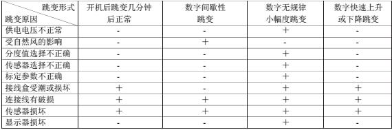 從表中可以看出,開機后跳變幾分鐘后正常和數(shù)字快速上升或下降跳變與接線盒受潮或損壞、傳感器損壞、連接線有破損有直接關(guān)系;間歇性跳變與傳感器損壞和連接線有破損有直接關(guān)系;數(shù)字無規(guī)律小幅度跳變與所有因素均可能有關(guān),所以在查找原因時有一定困難,只能用排除法進行查找原因。